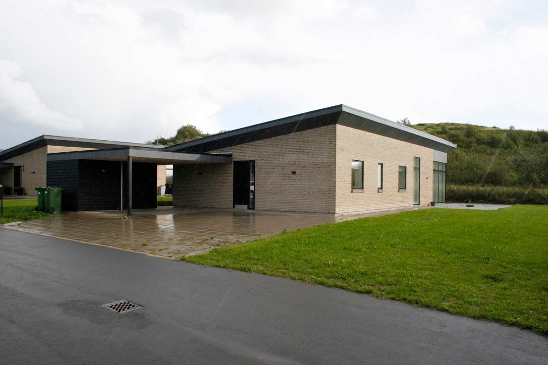 På en ca. 1800 m2 stor grund er der tegnet tre ens boliger på hver 150 m2 med tilhørende carport og skur. Husene er udformet med ensidig taghældning.